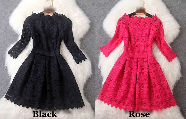 Sweet Pink Lace Crochet Hollow out Dress &Party Dress